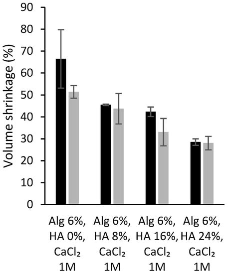 Volume shrinkage (in percentage) of different alginate-HA aerogel scaffolds without (grey bars; source: ref. [7]) and with the dual crosslinking treatment (black bars; this work).