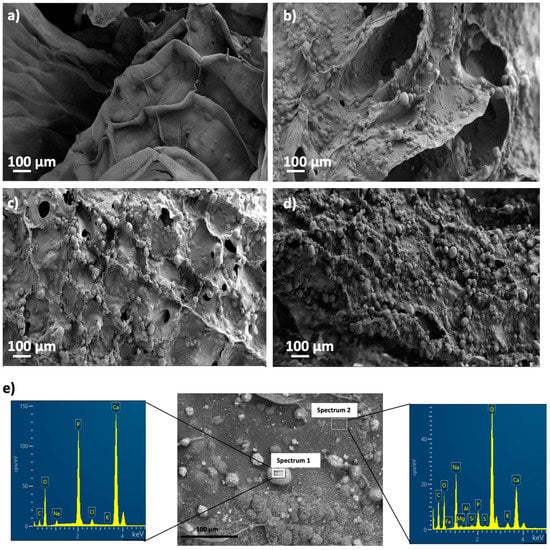 SEM pictures of aerogels printed from alginate 6 wt.% inks and different HA concentrations: (a) 0, (b) 8, (c) 16, and (d) 24 wt.%, after bioactivity tests. Aerogels were aged and crosslinked with GA vapor prior to being immersed in SBF medium. (e) EDX spectra of Alg 6%, HA 8%, CaCl2 1M1h GA aerogels after SBF treatment in an apatite granule region (Spectrum 1, left) and a background region (Spectrum 2, right), and representative of all the tested samples.