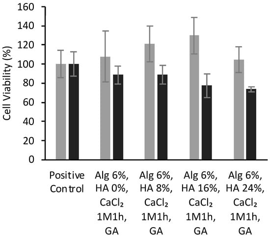 Viability (expressed in %) of BALB cells after 24 (grey bars) and 48 h (black) of contact with alginate-HA-GA aerogel scaffolds determined by WST-1 tests. There were no statistically significant differences among groups (t-test; p < 0.05).