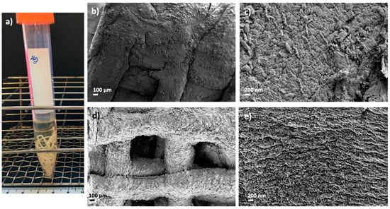 Supercritical sterilization of 3D-printed alginate aerogels: (a) Images of sterile and dual crosslinked aerogel scaffolds seeded on TSB tubes after 24 h of culture. Optical and SEM images of sterile (st) and aged aerogel scaffolds: (b,c) Alg 6%, HA 8%, CaCl2 1M1h, st and (d,e) Alg 6%, HA 8%, CaCl2 1M1h, GA, st. Aerogels were observed at two different magnifications.