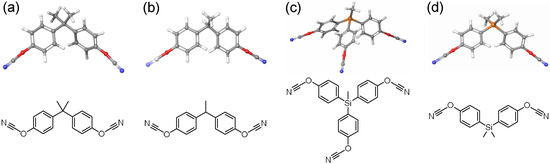 - Ghiassi, K.B.; Guenthner, A.J.; Redeker, N.D.; Boatz, J.A.; Harvey, B.G.; Davis, M.C.; Chafin, A.P.; Groshens, T.J. Insights into Melting Behavior of Propyl-Bridged Di(cyanate ester) Monomers through Crystal Packing, Thermal Characterization, and Computational Analysis. Cryst. Growth Des. 2018, 18, 1030–1040. [Google Scholar] [CrossRef]