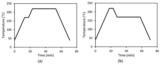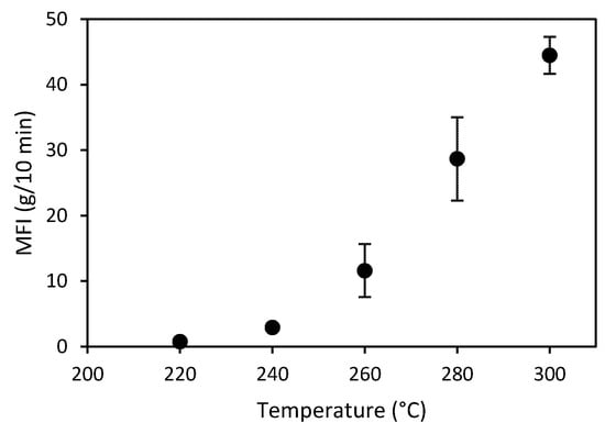 Melt flow index (MFI) of the studied polymers were determined for setting process conditions of the composites. The MFI was characterised using the melt flow tester, CEAST MF20, from Instron (Turin, Italy) and in accordance with ASTM D1238 [20]. The MFI analysis for PP was conducted at temperatures from 170 °C, 190 °C, 210 °C, 230 °C, and 250 °C with a 2.16 kg weight. The MFI versus temperature graph for PP was then plotted to determine the relationship between the MFI and temperature of the PP matrix. The MFI analysis of PC matrix was conducted at temperatures of 220 °C, 240 °C, 260 °C, 280 °C, and 300 °C with a 1.2 kg weight.