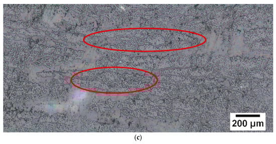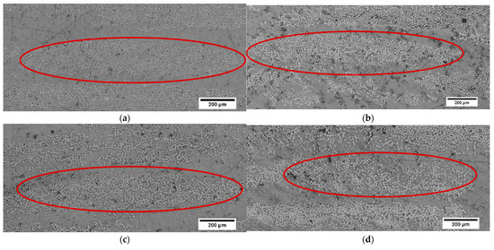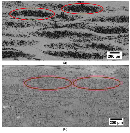 There was a significant number of voids, particularly between the fibre bundles for the undried BF-PC composite processed at a lower pre-consolidation temperature, as highlighted in the circles in Figure 3a. Higher pre-consolidation temperature and drying significantly improved the impregnation and matrix was observed in the middle of the fibre bundle, as seen in the highlighted areas in Figure 3b,c. The improved impregnation was also reflected in the increases in tensile and flexural properties (Table 4). Improved impregnation indicated fewer voids, as seen in Figure 3b,c, and voids are stress concentrators, which would have caused premature failure during mechanical testing.