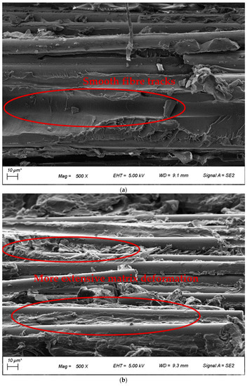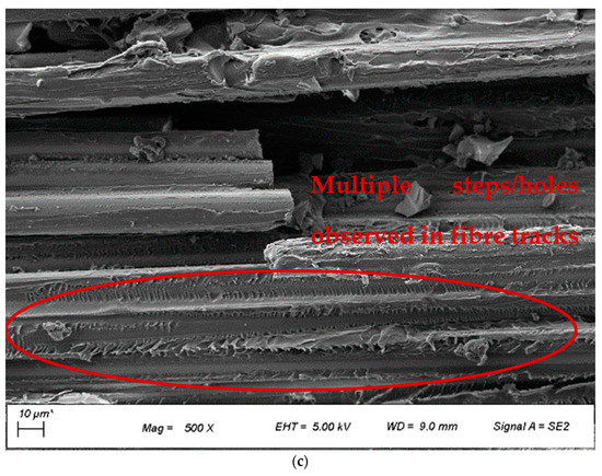 The investigation of composite quality was also conducted using FESEM images, as shown in Figure 4. Polymer residues were observed on the fibres of BF-PC composites processed at different pre-consolidation temperatures, indicating good fibre-matrix adhesion, as seen in Figure 4a–c. However, some slight differences were observed for the fibre tracks where the fibre was pulled out of the matrix. At a lower pre-consolidation temperature of 170 °C and with undried polymer, the fibre track was smoother with minimal matrix deformation, whereby at higher pre-consolidation temperatures of 260 °C and 280 °C, more extensive matrix deformation with multiple steps/holes was observed on the fibre tracks. This indicated slightly improved fibre-matrix adhesion with drying and with higher pre-consolidation temperatures, which aided in stress transfer from matrix to fibre and improved the mechanical properties.