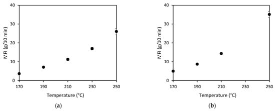 MFI against temperature for (a) PP and (b) PP with 3 wt% MAPP.