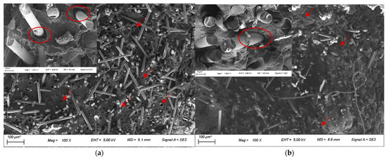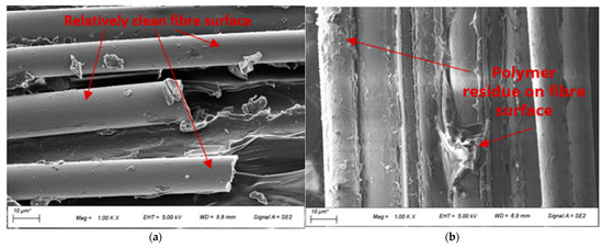 The improvement in tensile and impact strength of the composites with the use of compatibiliser can be attributed to the improved fibre-matrix interface between the basalt fibre and the PP matrix, leading to better stress transfer. This could be observed from the FESEM images of the composite fractured surface, as seen in Figure 9a,b. There were a higher number of holes and large gaps observed between the fibres and matrix for unmodified BF-PP, while the gaps were significantly smaller when MAPP was added to the polymer matrix. In addition, a smooth fibre surface could be seen for the unmodified BF-PP, whereas a slightly rougher fibre surface with polymer residues was observed in the modified composite system.