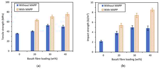 (a) Tensile strength and (b) impact strength of short BF-PP composites with and without the use of MAPP as compatibiliser.