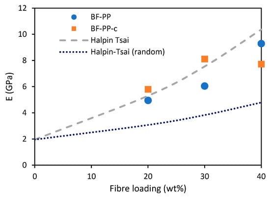 Young’s moduli of the short BF-PP composites were predicted using the Halpin–Tsai models. The parameters used are summarised in Table 7. The experimental results match better with the Halpin–Tsai model as compared to the Halpin–Tsai (random) model, indicating that there is some degree of orientation of the fibres along the testing direction, see Figure 10. This could be due to the induced polymer flow during the extrusion and injection moulding processes, which allows the fibres to be aligned along the length of the tensile specimens. In addition, the measured dimension of the basalt fibre has a large standard deviation that contributed to some over-prediction.