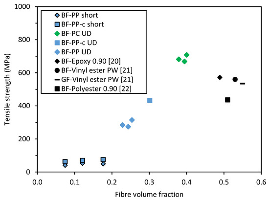 Benchmark of tensile strength values of BFRTP with other BFRP and GFRP. Note: Literature values are in black, and the experimental values are in green or blue. The sample nomenclature is by fibre type, matrix type and followed by the fibre architecture. For example, BF-PP short denotes the values for short BF-PP composites.
