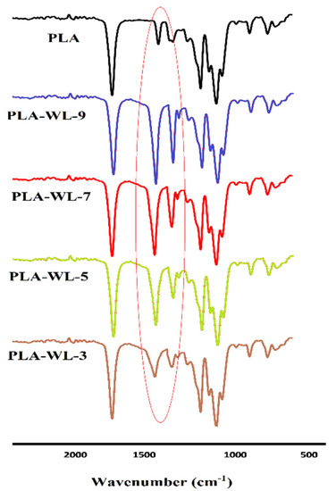 FTIR spectra of PLA and PLA-WL biocomposites.