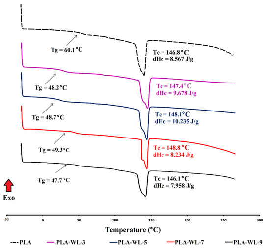 The DSC analysis was employed to investigate the effect of various filler (WL powder) loadings on the thermal characteristics of the developed PLA-WL biocomposites. Understanding the polymers’ crystallization behavior under dynamic conditions is considerable because most processing procedures perform in non-isothermal conditions [64,65]. Figure 4 illustrates the crystallization exotherms of the PLA-WL biocomposites. The parameters of the DSC curves for crystallization exotherms, such as the crystallization peak (Tc), glass transition temperature (Tg), and the crystallization enthalpy (dHc), were calculated from the under peak surface area.