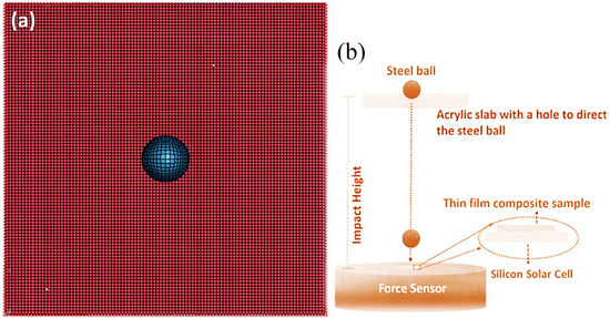 Schematic of the 2D plane–strain FE model (a) with thin film shell elements of multilaminate structures under impact loading mimicking the ball-dropping impact test (b) as described in our previous report [30].
