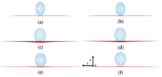 FE simulation showing impact contact between the sphere and the composite plate, (a) t = 0.4388 ms, (b) t = 1.4399 ms, (c) t = 1.8899 ms, (d) t = 5.5788 ms, (e) t = 7.8338 ms and (f) t = 9.9811 ms.