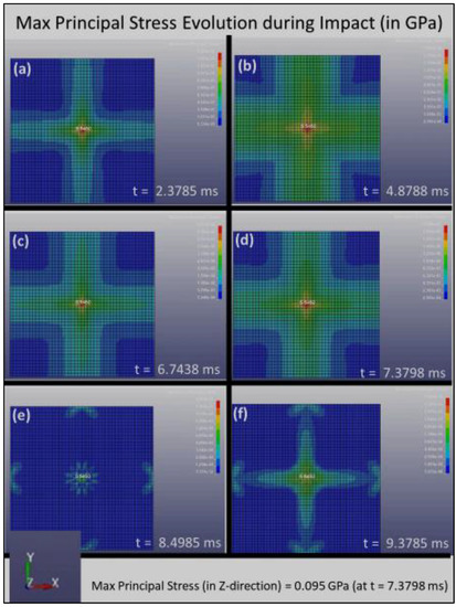 Figure 4 clearly shows that the stress distribution during impact loading follows the four-symmetry that is created by the grid pattern of Composite Plate A, which consists of layers with fiber alignments of [0°, 90°, 180°, 270°, 360°]. Stress concentrated at the center of the plate and reaches the maximum principal stress (which occurred in all composite plates in the present study in the z-direction) of 0.095 GPa at t = 7.3798 ms. Over time, the stress reduces and finally reaches the zero-stress state after about 9.5 ms.