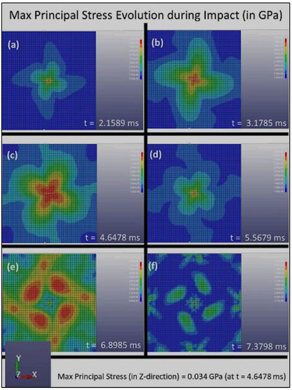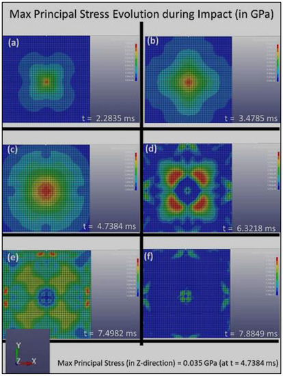 Figure 5 clearly shows that the stress distribution during impact loading follows the double four-fold symmetry that is created by the grid pattern of Composite Plate B, which consists of layers with fiber alignments of [0°, 45°, 90°, 135°, 180°, 225°, 270°, 315°, 360°], as illustrated in Figure 2b. Figure 5 also shows that the stress concentrated at the center of the plate and reaches the maximum principal stress (in the z-direction) of 0.035 GPa at t = 4.7384 ms. Over time, the stress reduces and finally reaches the zero-stress state after about 8 ms. These parameters clearly demonstrate a much higher dissipation rate of damage in Composite Plate B, as compared to Composite Plate A. The maximum principal stress shown here in Figure 5 (for Composite Plate B) is lower, and the rate in which the stress is distributed and subsequently reduced to zero upon the same impact loading (impact load and loading rate) is much higher. This suggests that Composite Plate B with 3D architecture consisting of layers with fiber alignments of [0°, 45°, 90°, 135°, 180°, 225°, 270°, 315°, 360°] is much more effective and efficient in absorbing and dissipating impact energy and damage compared to Composite Plate A.
