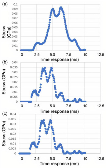 Figure 6 further suggests that Composite Plate C with 3D architecture consisting of layers with fiber alignments of [0°, 15°, 30°, 45°, 60°, 75°, 90°, 105°, 120°, 135°, 150°, 165°, 180°, 195°, …, 360°] is also much more effective and efficient in absorbing and dissipating impact energy and damage compared to Composite Plate A. It also exhibits an incremental increase in the absorption and dissipation rate of impact energy and damage compared to that of Composite Plate B. Figure 6 shows that the stress concentrated at the center of the plate and reached the maximum principal stress (in the z-direction) of 0.034 GPa at t = 4.6478 ms. Over time, the stress reduces and finally reaches the zero-stress state after about 7.5 ms. These parameters clearly suggest that the rotational angle of the 3D helicoidal architecture influences the impact resistance of the materials. The smaller rotational angles clearly play a key role in increasing the dissipation rate of the impact damage, although the increase could be moderated after some levels of rotational angles. This is further substantiated by the stress vs. time response data shown in Figure 7.