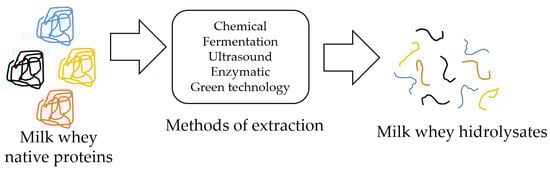 Milk proteins have been considered as the most important source of bioactive peptides; after their ingestion, these peptides can positively influence the cardiovascular, digestive, endocrine, immune, and nervous systems. Peptides represent a functional food because they not only satisfy the nutritional needs, but also help to reduce the risk of health problems []. Whey represents 95% of milk weight so it is a good source of bioactive peptides that can be produced by hydrolysis by applying different methods: enzymatic action, chemical treatment (acid or alkaline), microbial fermentation with proteolytic bacteria, ultrasound, thermal process, and others (Figure 1) [,].