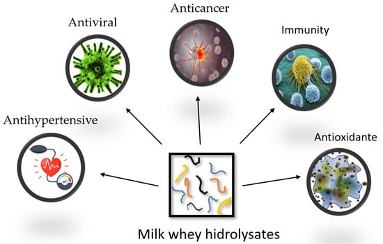 Milk whey biological functions are mainly related to the cardiovascular, digestive, endocrine, immune, and nervous systems. However, many of the bioactive peptides are encrypted in native whey protein, so in order to liberate these peptides, it is necessary to apply hydrolysis methods that generate milk whey hydrolysates. In recent years, milk whey hydrolysates have been studied due to their potential as a functional ingredient capable of producing beneficial effects on health such as immunity, antioxidant, anticancer, antiviral, and antihypertensive (Figure 2). At the same time, production of hydrolysates can be an interesting approach in adding value to whey protein, while at the same time protecting the environment from their pollutant effects [,,,].