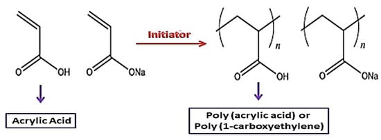 When all carboxyl groups dissolve, PAA has a high negative charge density. Neutralization transforms the acrylic acid monomer to sodium acrylate monomer in dissolved sodium hydroxide. As a result, this polymer and poly sodium acrylate are among the most widely employed water-soluble anionic polyelectrolytes, such as dispersion compounds, superabsorbent polymers, and ion-exchange resin. As indicated in Figure 1, they are exclusively produced by radical polymerization of sodium (acrylic acid) or acrylic acid [45,46,47].