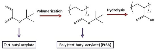 Different radical polymerization processes, such as inverse emulsion, have been used to make poly (acrylic acid). The developing polymer chains are not soluble in the monomer during bulk polymerization, resulting in precipitation polymerization, which poses practical issues in mixing and heat transmission. Solution polymerization is a quick and easy way to get past these problems. To commence polymerization, redox initiation is a particularly effective method of creating free radicals under favorable circumstances. This technique is widely used in low-temperature emulsion polymerizations [54]. PAA can be made by hydrolysis of a narrowly dispersed poly (tert-butyl acrylate) (PtBA) sample, as demonstrated in Figure 2. Anionic or controlled radical polymerizations make the poly (tert-butyl acrylate) sample. Other types of PAA possessing block copolymers comprised of poly(n-butyl methacrylate), poly(methyl methacrylate), polystyrene (PS), and poly(2-vinyl pyridine), also polymers with a consistent branching pattern, such as star and comb polymers can be synthesized using this process [55].