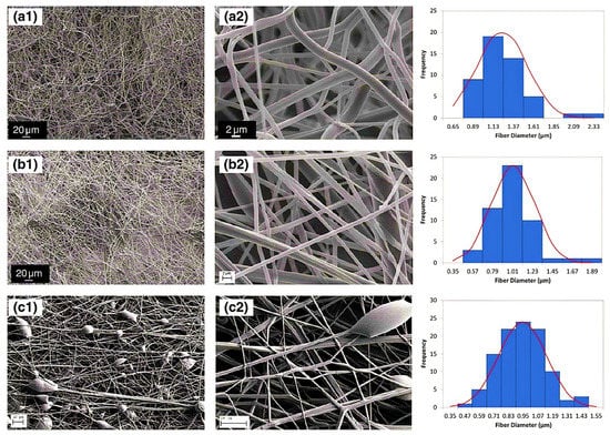 Diameter distribution and SEM micrographs of nanofibers of PAA (a) concentration of 12 wt% PAA and speed of 6000 rpm, (b) concentration of 12 wt% PAA concentration and speed of 8000 rpm, and (c) concentration of 9 wt% PAA concentration and speed of 4000 rpm. The SEM micrographs were taken at various magnifications: (a1,b1) 600×, (c1) 300×, (a2,b2) 7000×, and (c2) 15,000×. (Reprinted from Ref. [73] with permission).