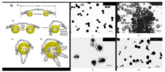 Representation of (i) binding of fibrinogen with PAA/Au nanoparticles (a) Binding of 7 nm nanoparticle to fibrinogen revealing each protein molecule accommodated two nanoparticles (b) 10–12 nm-sized nanoparticles prevent the binding of two particles to each fibrinogen due to the flexibility of fibrinogen at E domain of protein resulting the contact of second binding site with the nanoparticle (c,d) Larger nanoparticles (15–22 nm) can accommodate multiple fibrinogen molecules due to the larger surface area (ii) TEM of PAA-CS nanoparticles at (a) pH = 4.5 and (b) at pH = 7.4. (iii) Morphology of PAA-CS nanoparticles synthesized by the various processes at 4.5: (a) CS dropping into PAA solution; (b) PAA dropping into CS solution, (Reprinted from Refs. [81,83] with permission).