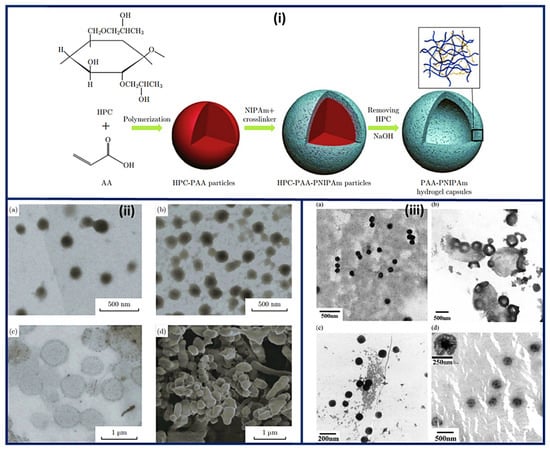 Nanocapsules have been the most extensively studied for functional compounds delivery [87]. Nanocapsule possesses a large inner cavity which helps in the high loading of drugs and sustained release of drugs due to its capsule-like structure [88]. The hollow tailor-made 100 nm nanocapsules of PAA/CS were fabricated for antibiotic therapy by Belbekhouche et al. [89]. Nanocapsules of PAA-N-isopropylacrylamide (PNIPAm) hydrogel are presented in Figure 5i suggests the polymerization and crosslinking of PAA with PNIPAm to form the nanocapsule architecture and unveiled the round shape morphology (135 nm) for PAA-hydroxypropylcellulose (HPC) template particles. At the same time, the figure was seen in the 1st step above. After crosslinking with PNIPAm, the core (dark) shell (dusky) structure was seen, increasing the size to 230 nm. Even after removing the template, the particles maintained the spherical morphology with a larger inner cavity and thin shell having 50 ± 12.5 nm thickness, Figure 5ii [90]. The Nanosphere of PAA/BSA showed the 80 nm diameter while the nanocapsules revealed the 300–500 nm. These were synthesized using in situ polymerization, swelling, and re-aggregation. The interior diameter was found 100–200 nm, and glutaraldehyde (GA) cross-linked PAA/BSA nanospheres increased the stability. After absorbing the water molecules into PAA/BSA/GA also, nanocapsules were also formed. Microspheres presented the porous shape, and the hollows were small in nanocapsules that suggested that the architecture of PAA/BSA was fixed by cross-linking agents and reduced its flexibility, Figure 5iii [91]. Nanocapsules of PAA-b-PAN di-blocks were prepared using PAA macroinitiators using RAFT polymerization. The same architecture revealed monodisperse and spherical with 30~35 nm hydrodynamic diameter analyzed by dynamic light scattering and TEM. The aggregation of these nanocapsules was occurred by π-π interaction of the graphite layers [92]. In situ acrylic acid polymerization was done to obtain liposome nanocapsules coated with PAA with a mean diameter of 123 ± 21 nm [93]. The core-shell structure for copolymers of PAA was seen in the nanocapsules of PAA with an average diameter of 70 nm and 10 nm of shell thickness [94].