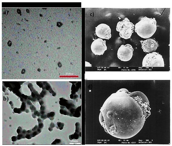 Poly (acrylic acid-b-isoprene) cross-linked micelle structures were synthesized using calcium phosphate coating (20 nm thickness) having 60 ± 9 nm mean diameter, revealing the mineralization near or at surface regions of PAA. Additionally, nanocages were also formed. These hybrid materials were found stable for numerous months in water. Even though it aggregated and mineralized with time, there was no change seen in crystallization and diameter even after eight months (Figure 6a,b) [95]. Spherical microspheres of PAA/PVA of sequential interpenetrating network crosslinked with GA were obtained via SEM analysis. Figure 6c suggested spherical morphology without any agglomerations. A smooth microspheres surface was obtained with no pores, and some particles were covered with polymeric debris, Figure 6d [96]
