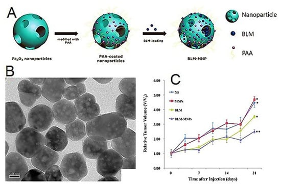 Zhaoqiang Zhang et al. synthesized a biocompatible and superparamagnetic hollow mesoporous nanoparticle based on Fe3O4 NPs with the ability of magnetic targeting. Then the nanoparticles were coated with PAA, which can load bleomycin (BLM) through bonding with PAA in the mesoporous structure (Figure 7A–C). The results demonstrated that designed systems could effectively load drug and release it sustainably. The therapeutic efficacy of hollow magnetic NPs was much higher than free drugs [104].