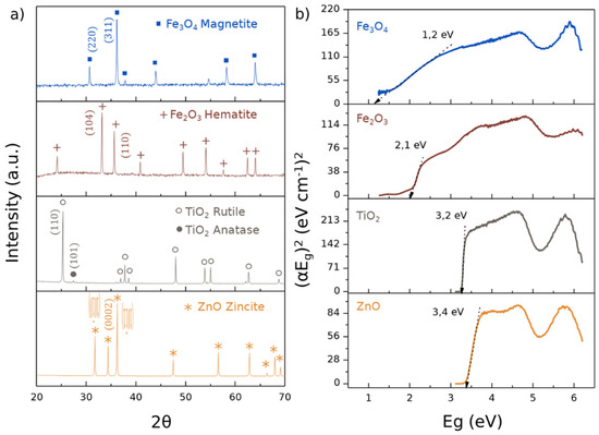 Characterization of semiconductive ceramic powders: TiO2, ZnO, Fe2O3, and Fe3O4. (a) The X-ray diffractions showing the phase compositions; (b) Kubelka–Munt calculations from the UVA–Vis spectra, also exhibiting bandgap values (eV).