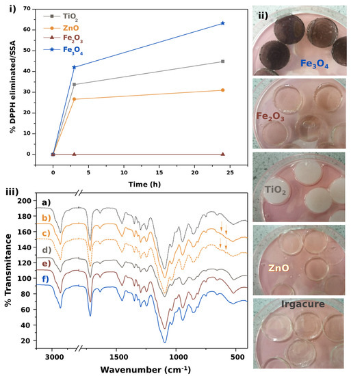 (i) Scavenging activity of various ceramic powder materials after 3 and 24 h; (ii) PEGDMA-based compositions using Irgacure and ZnO, TiO2, Fe2O3−, and Fe3O4 as photoinitiators; (iii) FTIR of PEGDMA-based composites synthesized by photopolymerization using different photoinitiators: (a) Irgacure, (b) ZnO, (c) nano-ZnO, (d) TiO2, (e) Fe2O3, and (f) Fe3O4.