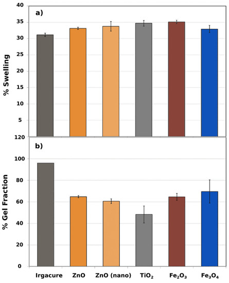 (a) Swelling percentages of the composites photoinitiated using Irgacure and different ceramic powders (ZnO, nano-ZnO, TiO2, Fe2O3, and Fe3O4); (b) gel fraction percentages of the composites photoinitiated using Irgacure and different ceramic powders (ZnO, nano-ZnO, TiO2, Fe2O3, and Fe3O4).