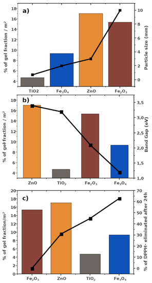 Since initiation is related to the photocatalytic activity, it is possible to relate the gel fraction percentage to bandgap values, the specific surface area and, consequently, the particle size. However, it does not appear that any of these parameters follows the trend of the gel fraction (Figure 4a,b). It is important to recall that there is a relationship between photocatalysis and the reactive sites, related to the unsaturated metallic atoms (Ti5c, Zn3c, Fe5c, or Fe3c). However, in this study, the scavenging activities and the gel fractions per m2 of specific surface area did not seem to be correlated (Figure 4c). Therefore, it is possible that another key parameter could be involved in the efficiency of photoinitiation.
