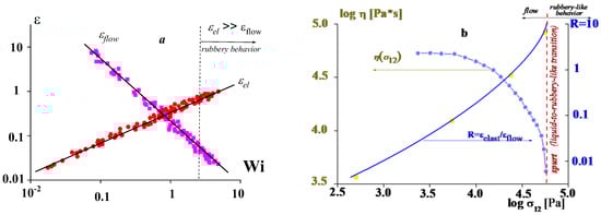 A similar picture of the linear-to-non-linear transition takes place in extension. Figure 5 shows the deformation rate dependences of the flow and elastic strains expressed by the Henky measure () [10,11,12].