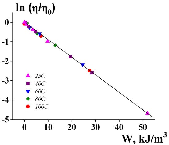 The correlation between elasticity and non-Newtonian flow is shown in Figure 2, which shows the direct dependence of the apparent viscosity and the stored (elastic) energy in a wide range of the viscosity change.