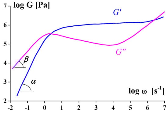 Typical frequency dependences of the components of the complex dynamic modulus for polymer melt (tan α = 2; tan β = 1).