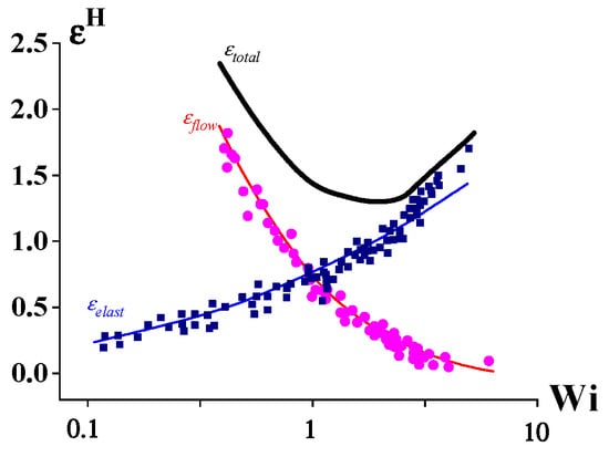 One can see that the minimum of the total deformation corresponds to Wi of the order of 1. At higher Wi values, the elastic deformation predominates, and flow becomes negligible. This is a typical flow-to-rubber transition equivalent to the transition detected on the frequency dependences of the complex elastic modulus.