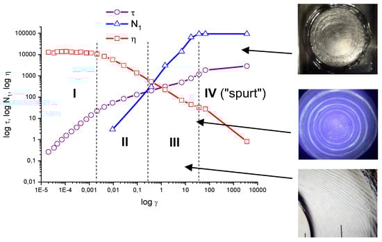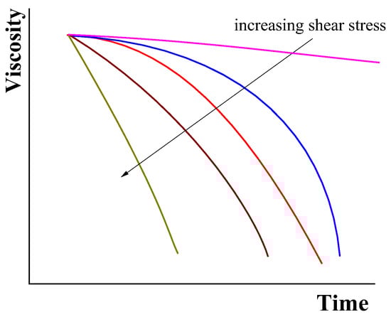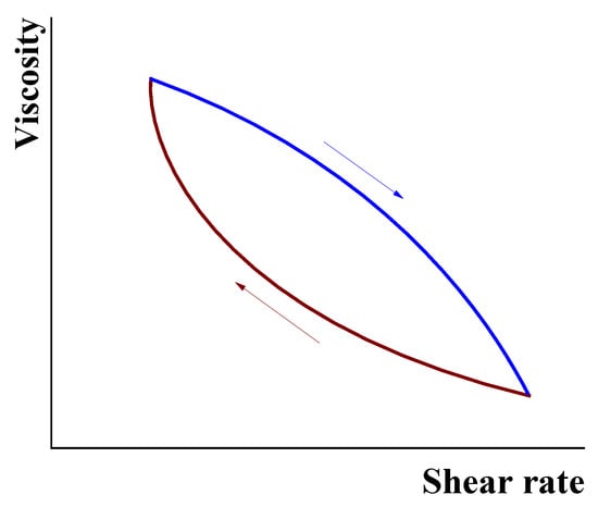 Structure aspects of the non-Newtonian behavior are the most evident in observation of the thixotropic behavior of complex liquids. Wo. Ostwald’s concept (1929) of “structural viscosity” (Strukturviskosität) that was developed in the monograph Thixotropy by H. Freundlich (1935). This was one of the historical milestones in rheology. This phenomenon is understood as time-dependent changes in rheological properties not related to viscoelasticity or other processes occurring in time (e.g., polymerization). Meanwhile, it is not always easy to separate these two types of time effects. Formally, “pure” thixotropy is observed if a time-dependent viscous stress only takes place with stress relaxation or recovery (elastic) strain [26]. One can find a detailed discussion concerning the difference between thixotropy and other time-dependent processes in [27,28].