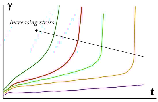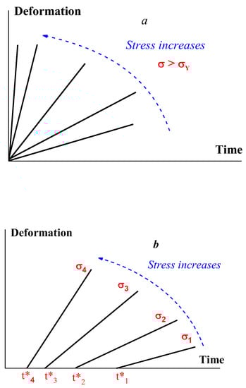 Nevertheless, the main reason of the difficulties in the measuring is time effects, which were briefly mentioned in the previous section devoted to the thixotropic effects happening in time. These effects show, in particular, that yield stress is not a constant inherent to a particular viscoplastic material because the point of the solid-to liquid transition depends on stress. This transition is described not by a single point, but it is characterized by the durability of the structure, i.e., by the dependence , where t* is the time corresponding to the solid-to-flow transition. An example illustrating the difference between the initial (Bingham’s) understanding of yielding and the concept of durability is shown in Figure 9.