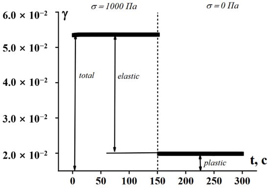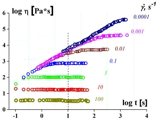 Measuring in the range of low stresses and shear rates should determine whether this material is a viscoplastic fluid or this is a liquid and its flow curve includes the plateau of the maximal Newtonian viscosity. In everyday experimental practice, such measurements are performed in many cases, and a flow curve is a measure in the scanning mode of the changing shear rate. This is promoted by modern technique using the software that allows for using “comfortable” procedure without human continuous control. The comparison of experimental data obtained at different shear rates and at prolong measuring shear stress (or apparent viscosity) is shown in Figure 11 [55]. Let the length of a time step t at every shear rate be chosen as 10 s.