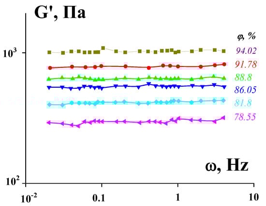Frequency dependences of the elastic modulus of highly concentrated emulsions below the yield stress, (according to the experimental data presented in [63]). Concentrations are shown at the curves.