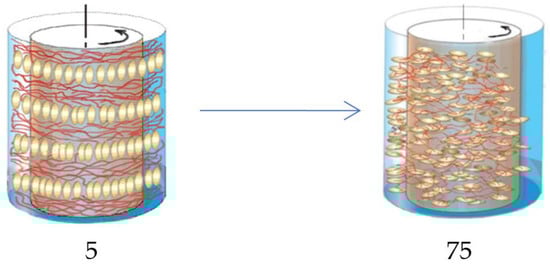 The rather commonly used practice in evaluating the thixotropic behavior for industrial fluids is measuring viscosity in a scanning regime at increasing and decreasing shear rate. The effect of bifurcation is shown in Figure 6, and can be estimated by the area between the up and down curves treated as the work spent for changing the structure of a liquid.