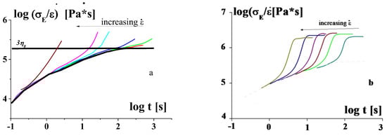 It is seen that the lower the shear rate, the longer the time it takes to reach a time-independent viscosity value. This might be treated as the limit of viscosity corresponding to the Newtonian plateau. However, in the scanning mode of measuring, all viscosity values at shear rates, lying on the right of the cross-point of the dotted line, predict the existence of the Newtonian plateau. Indeed, t = 10 s (at this example) is not enough to reach the steady flow that is a necessary condition for finding a correct value of viscosity. Then, the observed “viscosity” corresponds to the transient state and the apparent “viscosities” are the same, regardless of the shear rate as clearly seen in Figure 11. This creates a false impression that we have reached the plateau of the maximum Newtonian viscosity. The lower the shear rate or the longer the time of shearing, the higher the apparent viscosity seems, and finally it becomes infinitely high at the yield stress because “No steady state flows below the yield stress…” [57].