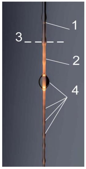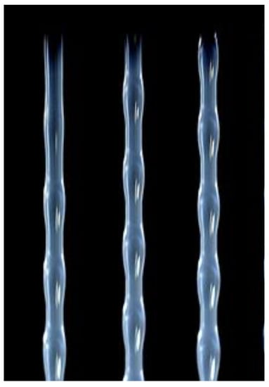 - Bhat, P.P.; Appathurai, S.; Harris, M.T.; Pasquali, M.; McKinley, G.H.; Basaran, O.A. Formation of beads-on-a-string structures during break-up of viscoelastic filaments. Nat. Phys. 2010, 6, 625–631. [Google Scholar] [CrossRef] [Green Version]