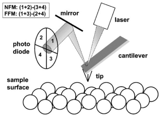 AFM operation principle. The cantilever with its tip is deflected by the sample surface topography, which is detected with a laser-optical set-up. The photodiode measures normal forces (normal force microscopy, NFM) and frictional forces (FFM) moving the tip. The piezotube scanner allowing scanning motions in x- and y-directions as well as moving in z-direction is not shown here. Reprinted from [7], Copyright (2001), with permission from Elsevier.