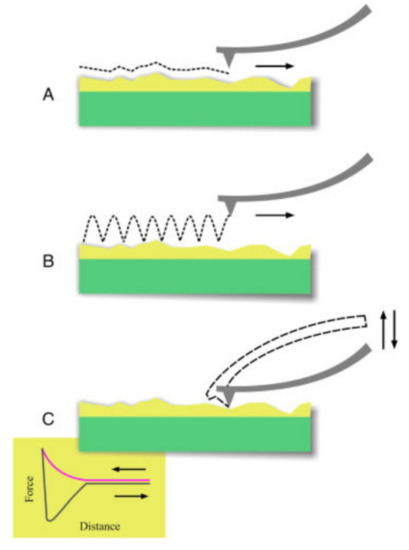 The cantilever can approach the sample surface in different ways—either in the contact mode (Figure 2A) or in the dynamic (tapping) mode (Figure 2B) [8]. While the resolution can be higher in the contact mode, the lateral forces due to the friction between the tip and sample may be problematic for soft or uneven surfaces, which is why for such samples often the dynamic mode is chosen. This means that the cantilever performs oscillations near its resonance frequency and only taps towards the sample briefly, so that the lateral movement can be performed without the tip sticking to the sample surface [8]. It should be mentioned that in the so-called noncontact mode, the cantilever also vibrates, but with a smaller amplitude, thus not touching the sample surface. Yang et al. reported that the noncontact mode exerts a delicate force on the sample at the cost of less precise height measurements, while the tapping mode caused deformations of the soft materials, especially in liquid environments [9]. Such topography investigations have been performed on many different materials during the last decades, e.g., on food biopolymers [10], on biopolymer networks [11], proteins and DNA [12,13], or hydrogels [14].