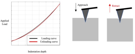 Nanoindentation in the AFM can be used to evaluate the mechanical characteristics of biological and other samples. Such experiments are performed by indenting the AFM tip into the sample and retracting it again, leading to load-indentation curves, as shown in Figure 6 [29]. The authors describe different possibilities for the evaluation of such experiments, i.e., the most often used Hertz model and the Oliver and Pharr analysis, and evaluate the influence of the indenter shape. They found clear differences for not perfectly elastic samples and suggested the Hertz model only in this case. Recently, Kontomaris et al. discussed an extension of the Hertz model for biological samples including indentation depth, tip radius, and sample shape to overcome problems with the common Hertz model [30].
