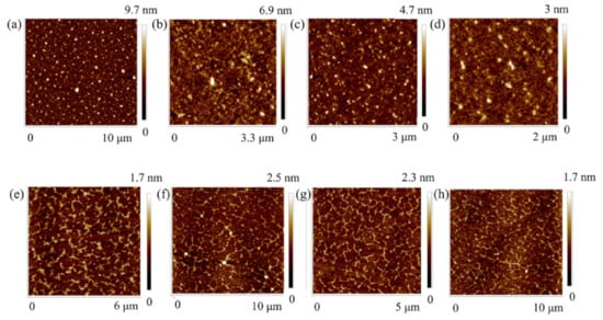 AFM images of polysaccharide extracts from Euchema, mostly containing ι-carrageenan. Extraction conditions/temperatures were: (a) 0.02 mg/mL 60 °C extract; (b) 0.02 mg/mL 70 °C extract; (c) 0.02 mg/mL 80 °C extract; (d) 0.02 mg/mL 90 °C extract; (e) 0.002 mg/mL 60 °C extract; (f) 0.002 mg/mL 70 °C; (g) 0.002 mg/mL 80 °C extract; and (h) 0.002 mg/mL 90 °C. Reprinted from [136]. Copyright (2020), with permission from Elsevier.