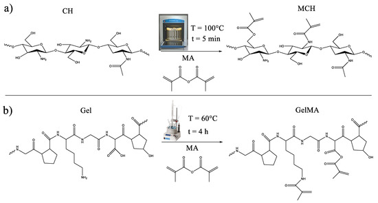 Chitosan and gelatin were methacrylated, following the previously reported experimental procedure, to make them photocurable [33,34]. The schemes of the methacrylation reactions are reported in Figure 1.