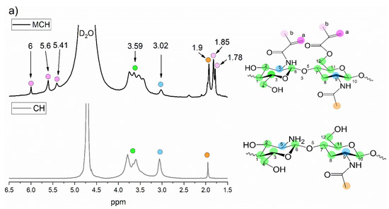 The CH and Gel methacrylation reactions were investigated and confirmed by 1H-NMR and FTIR. Figure 2a shows a comparison between the CH and MCH 1H-NMR spectra. The CH spectrum displays the typical CH peaks: the quadruplet peak at δ = 3.59 ppm represents the protons in 1–4, 6–10, 12 positions while the peak at 3.02 ppm represents the protons in 5, 11 positions of the chitosan ring. The peak at δ = 1.9 ppm represents the (N-acetyl)d-glucosamine group [48,49]. In the MCH spectrum, new peaks can be seen at δ = 6, 5.60 and 5.41 ppm representing the =CH2 of the methacrylic double bonds and at δ = 1.85 and 1.78 ppm corresponding to the −CH3 methyl groups of the grafted methacrylated moieties. As can be observed, there are two types of −CH3 signals and three different peaks corresponding to the =CH2 protons, meaning that the methacrylated groups are bonded to both the −NH2 and the −OH groups of the chitosan.